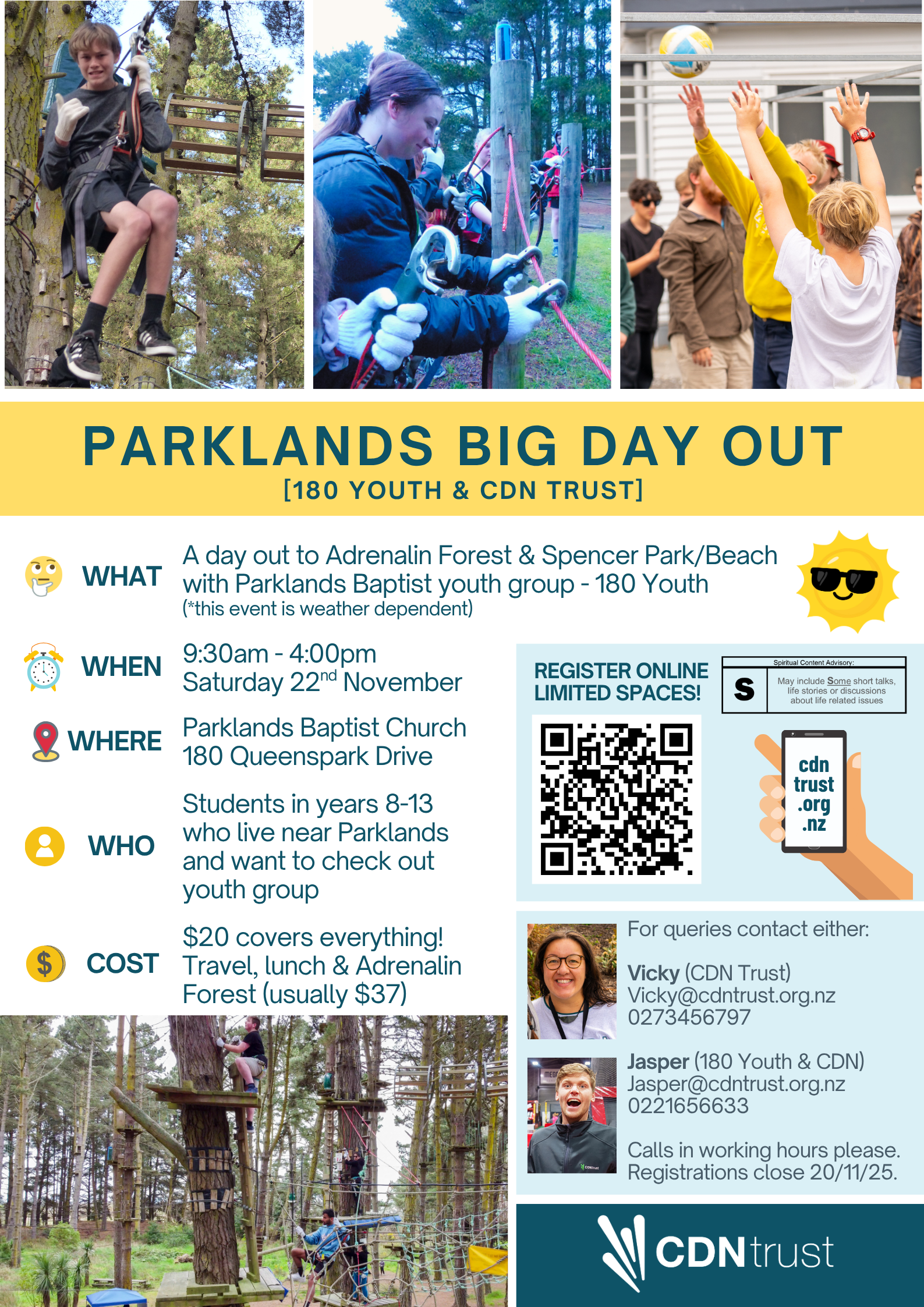 We will email caregivers with reminders and extra details the day before the event. It is important that young people who want to participate wear/bring the right gear for the day including closed toe shoes for Adrenalin Forest and togs etc in case we go swimming.